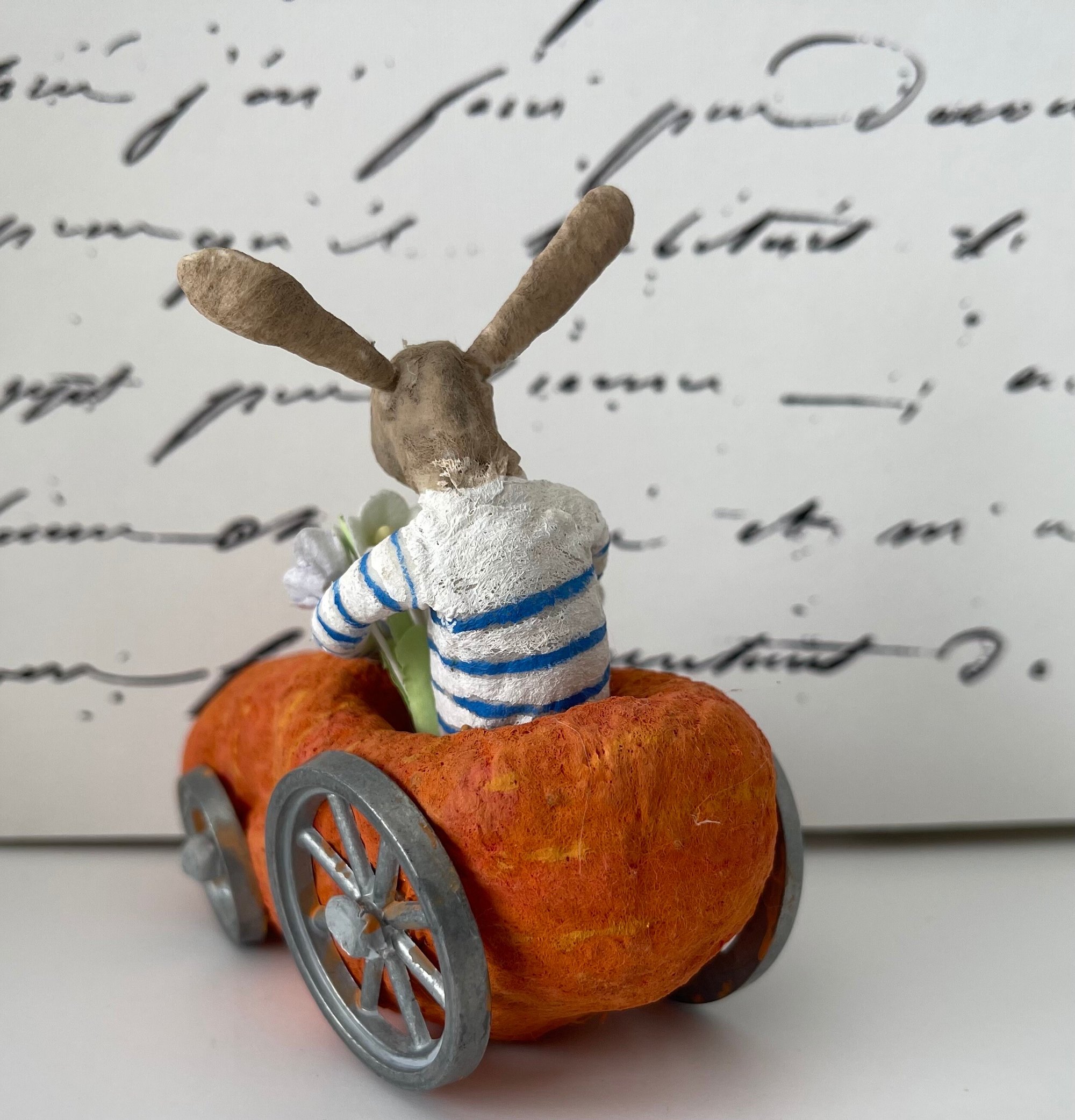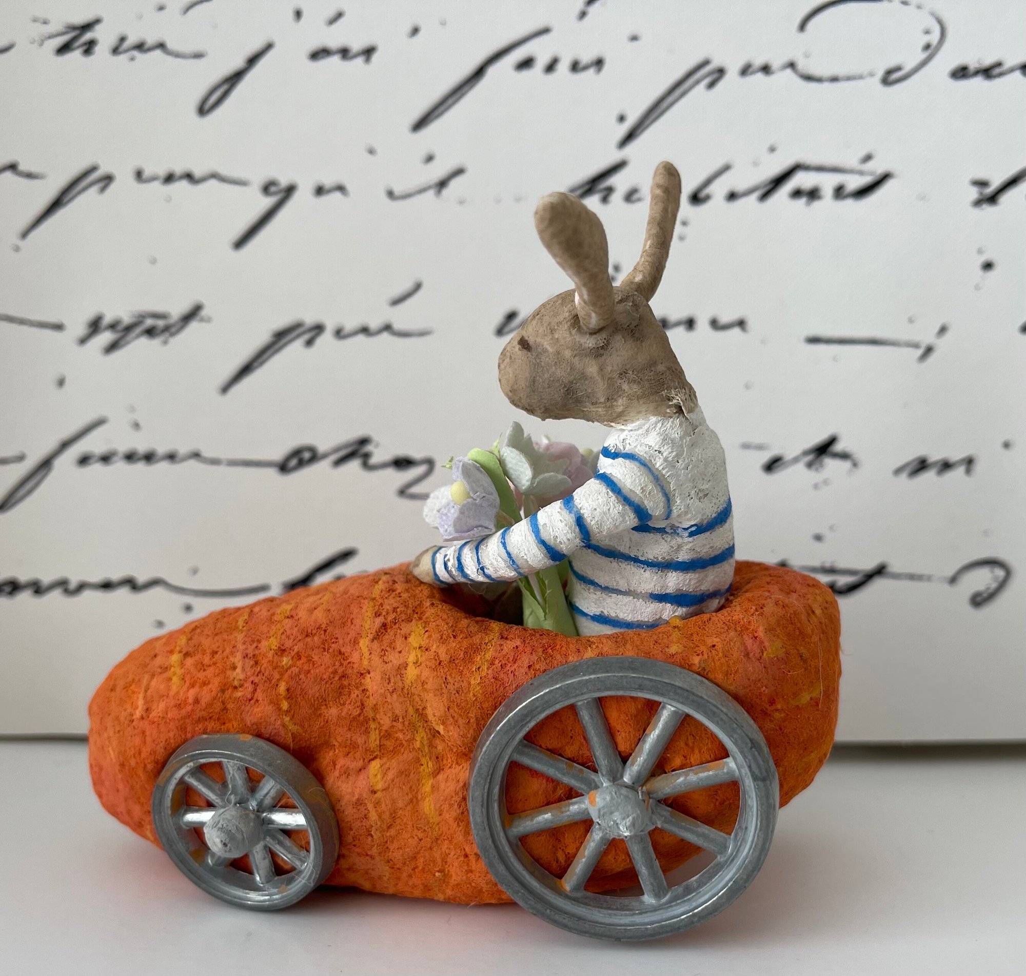 Sweet spun cotton bunny on a drive in his carrot car loaded with vintage stock paper flowers. He's wearing a French Brenton striped shirt and enjoying the coastal breeze in his ears.