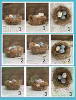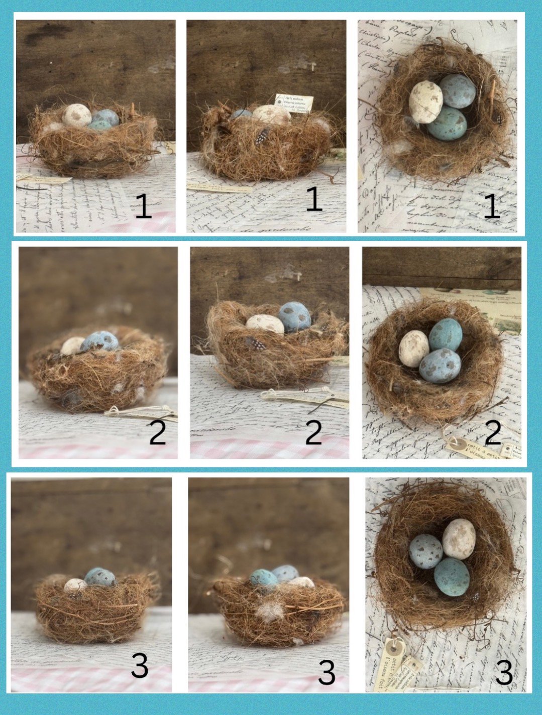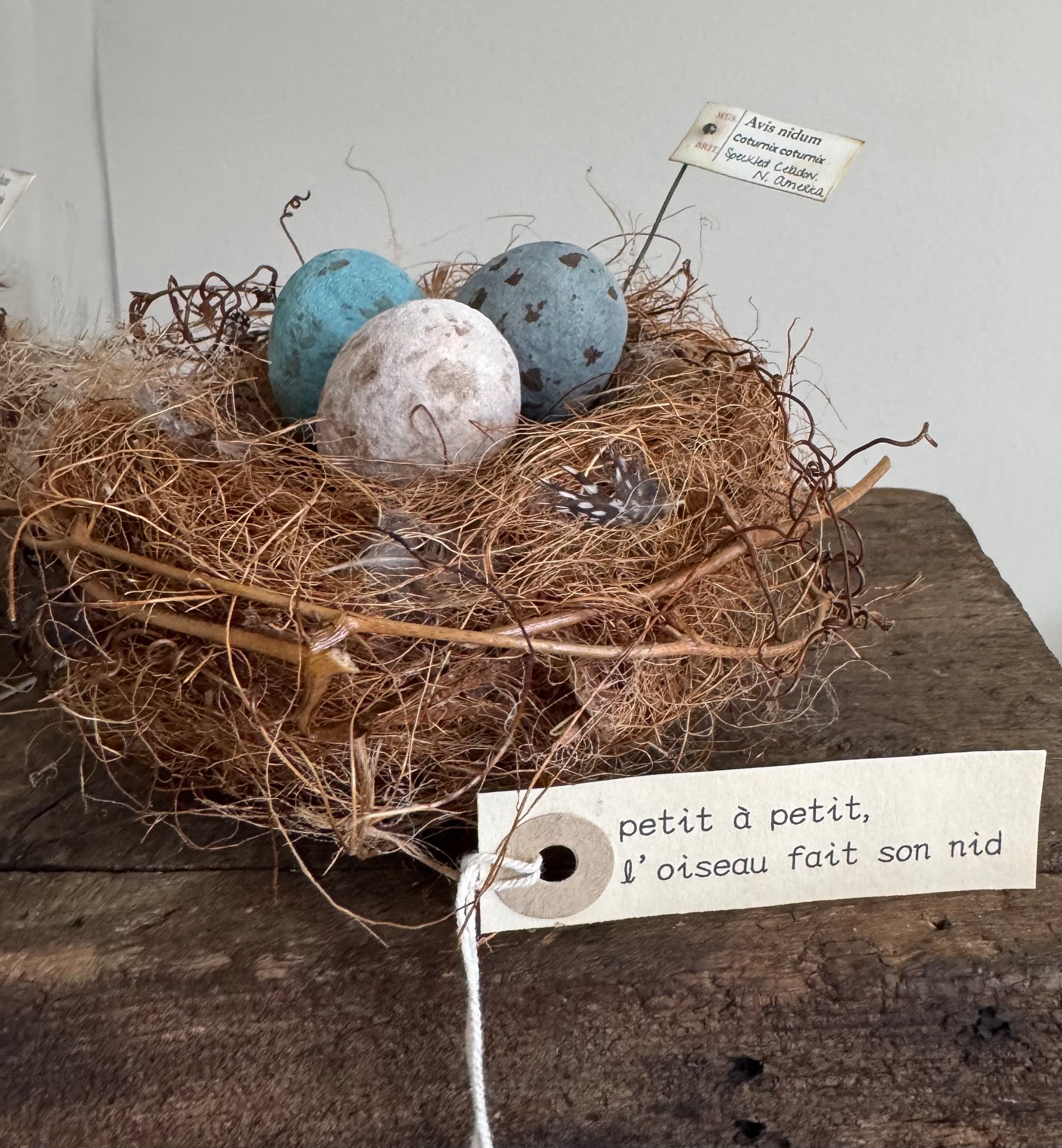 These sweet nests are created entirely by hand using natural materials like coconut fiber, sisal, and foraged vines and grasses. Each nest is feathered and holds three spun cotton speckled eggs in robin blue, duck egg, and cream, and a handmade label like those found on vintage museum specimens.