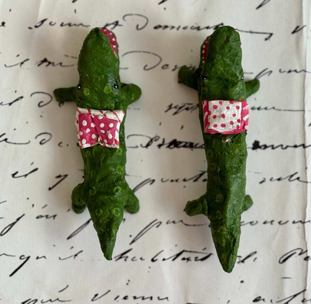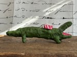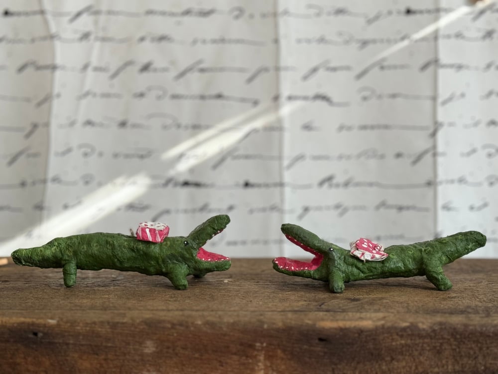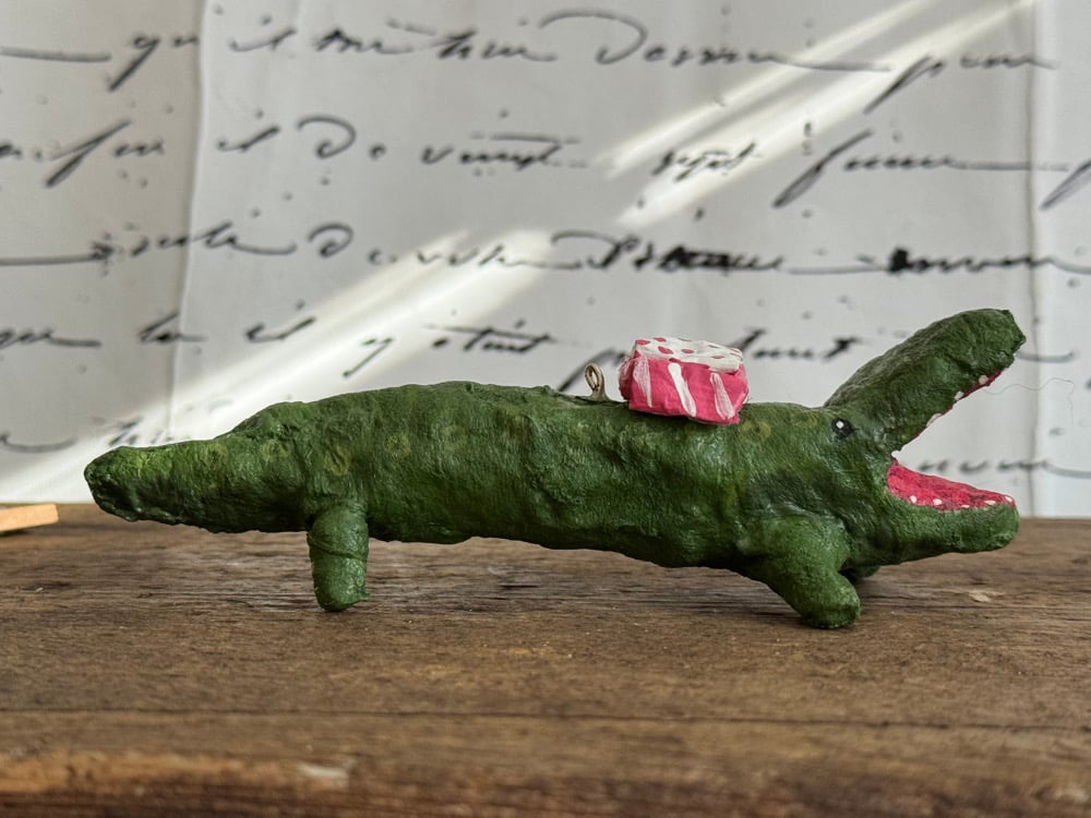 Handmade spun cotton alligator is toting presents to your Christmas tree this year!