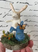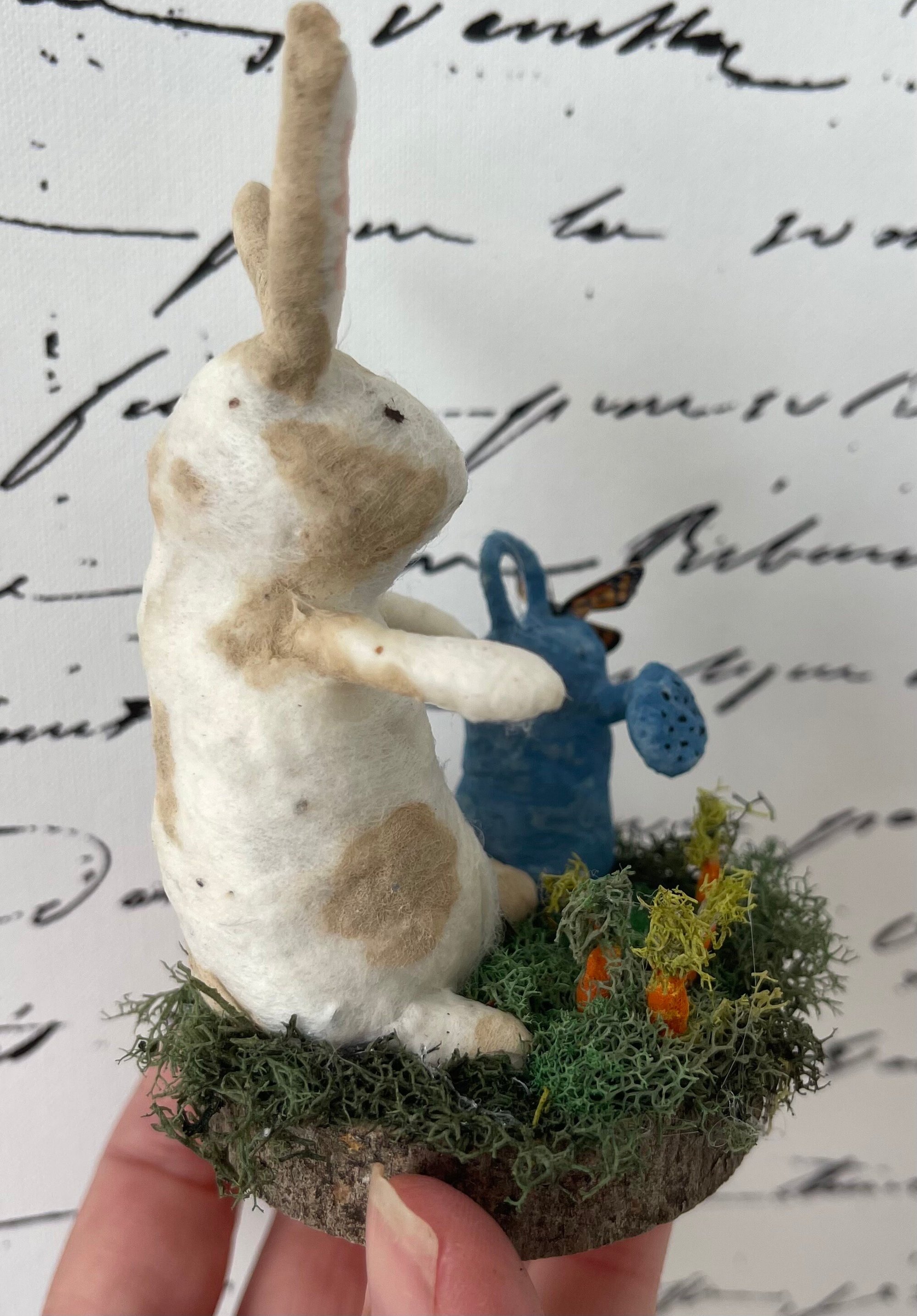 Bunny watering his carrot patch with blue watering can. Bunny, carrots, and watering can are all spun cotton. Butterfly is delicate.