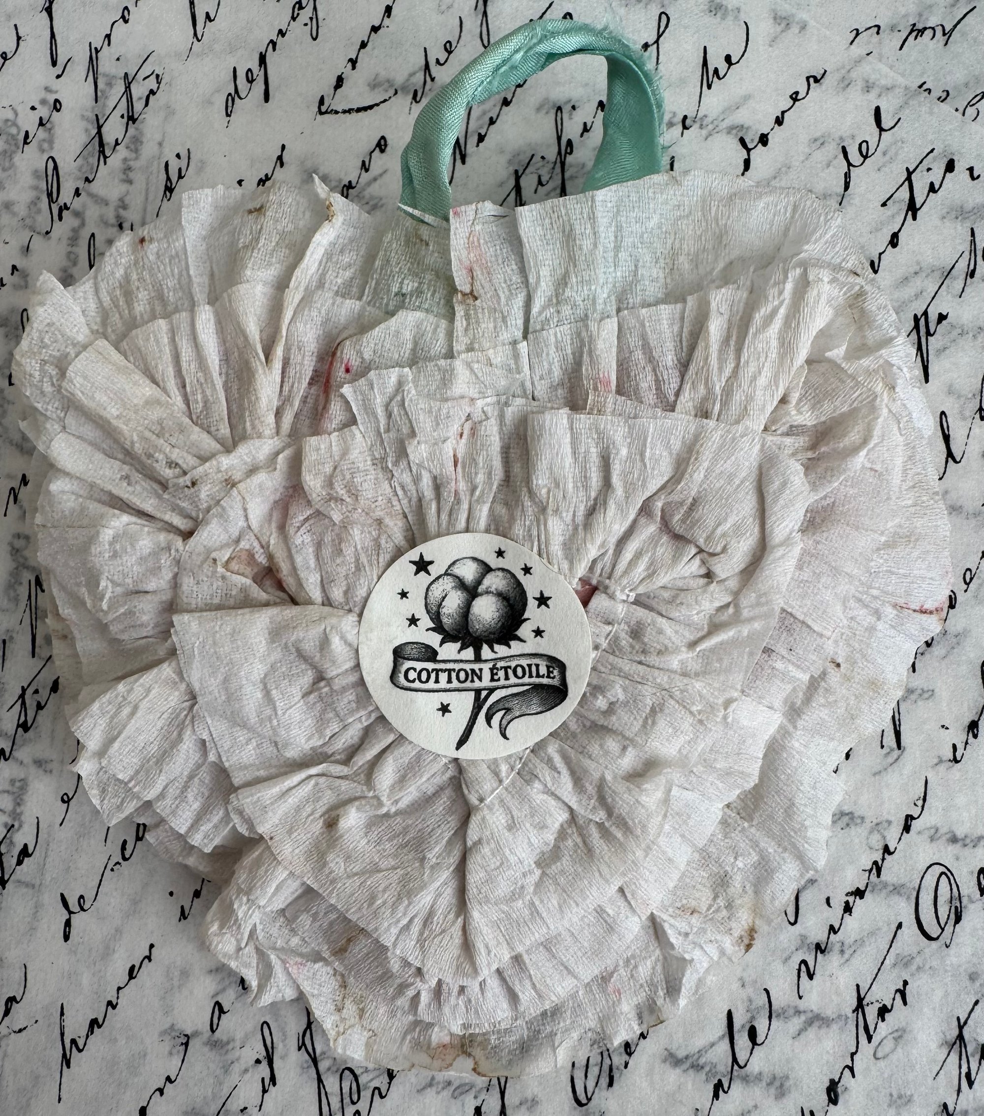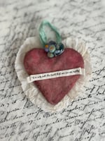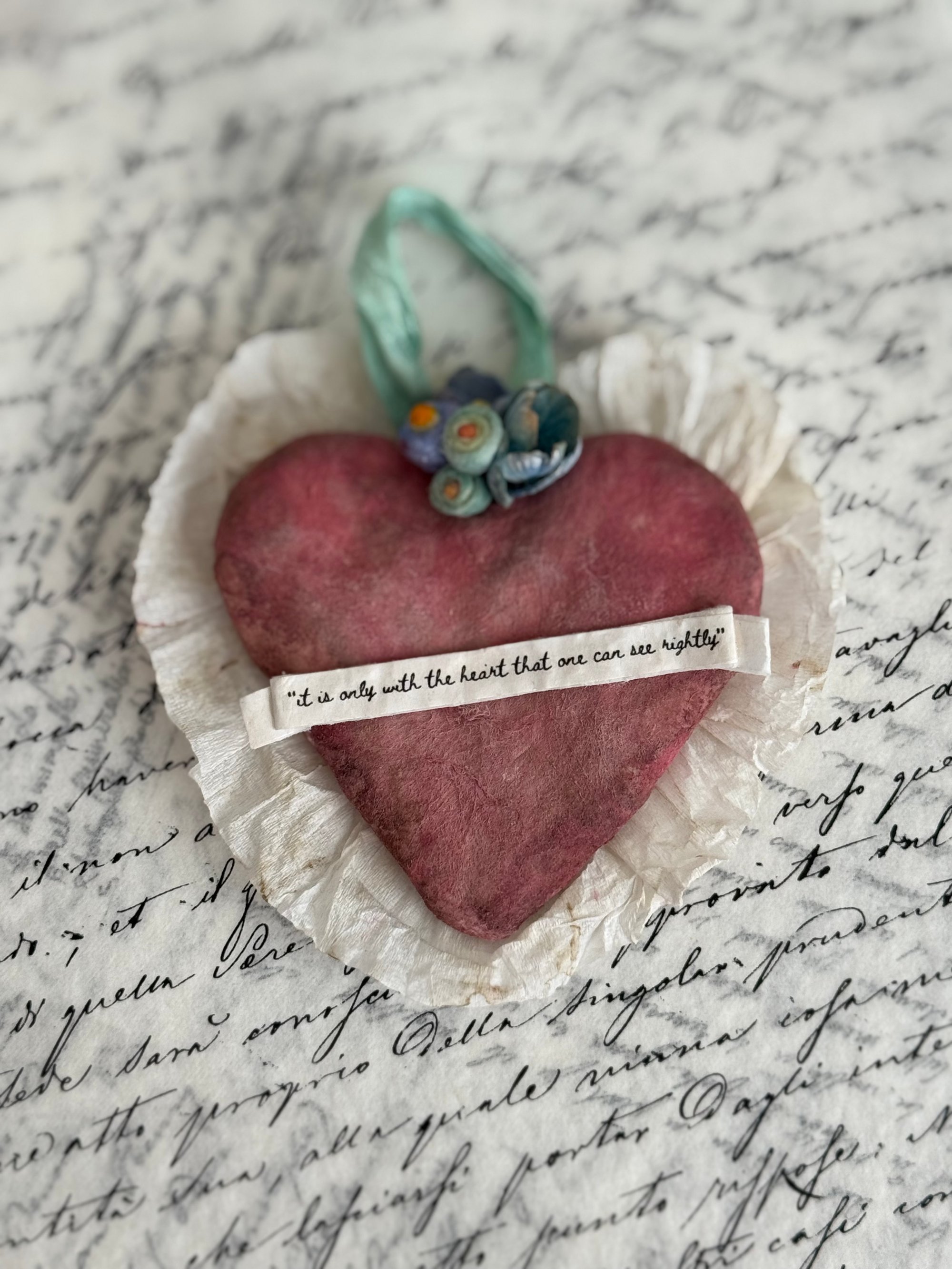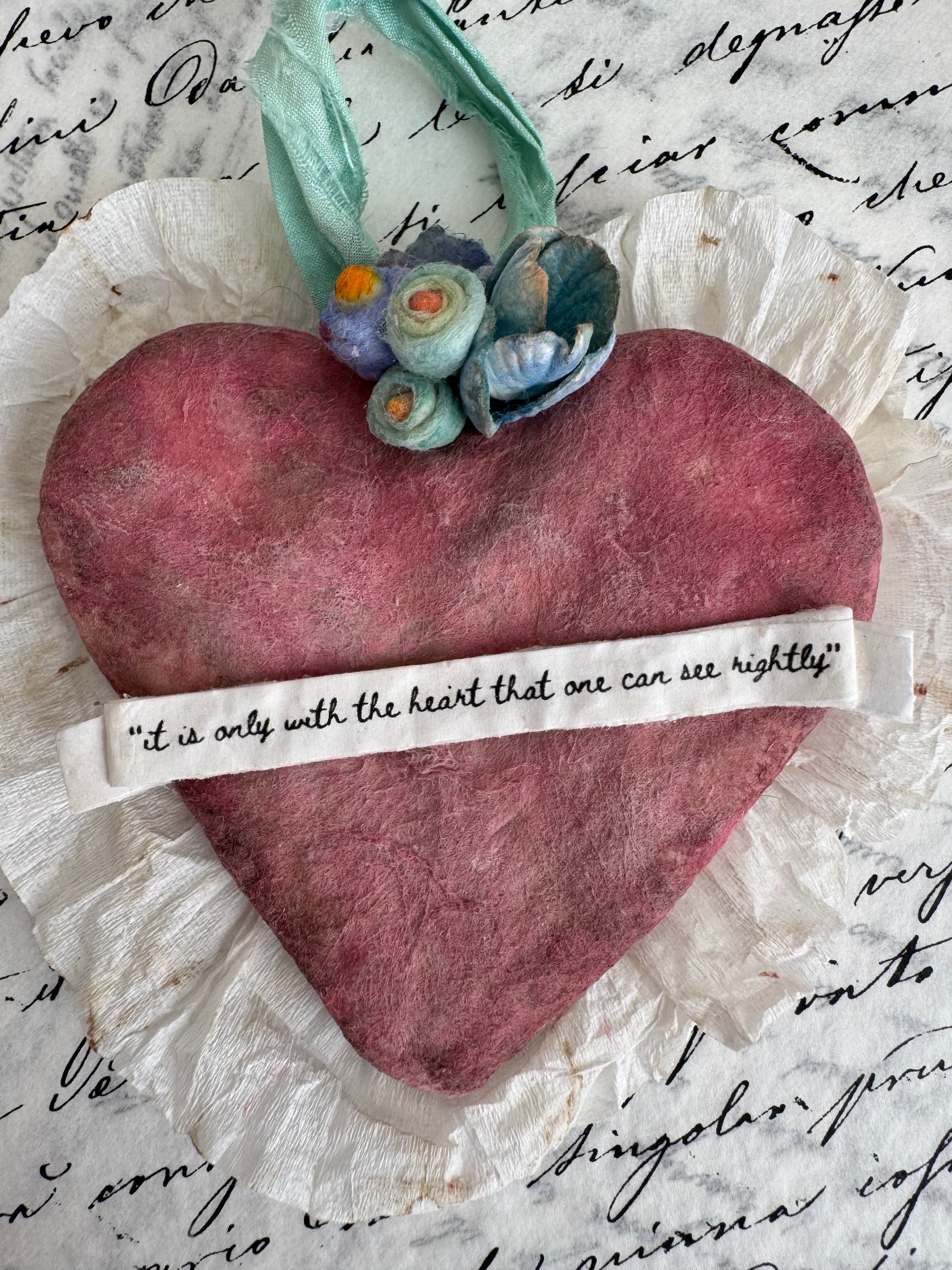 The beautiful line from Antoine de Saint-Exupéry's The Little Prince, "It is only with the heart that one can see rightly" adorns this intentionally aged spun cotton heart. A mix of hand painted paper and spun cotton blue flower bouquet and distressed paper ruffle with dyed silk hanging ribbon complete this beautiful Valentine.