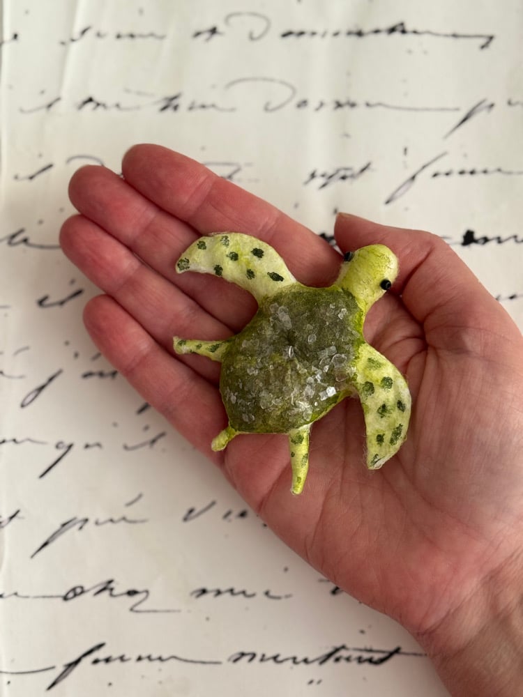 Handmade spun cotton green sea turtle Christmas tree ornament with natural mica flake dusting.