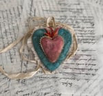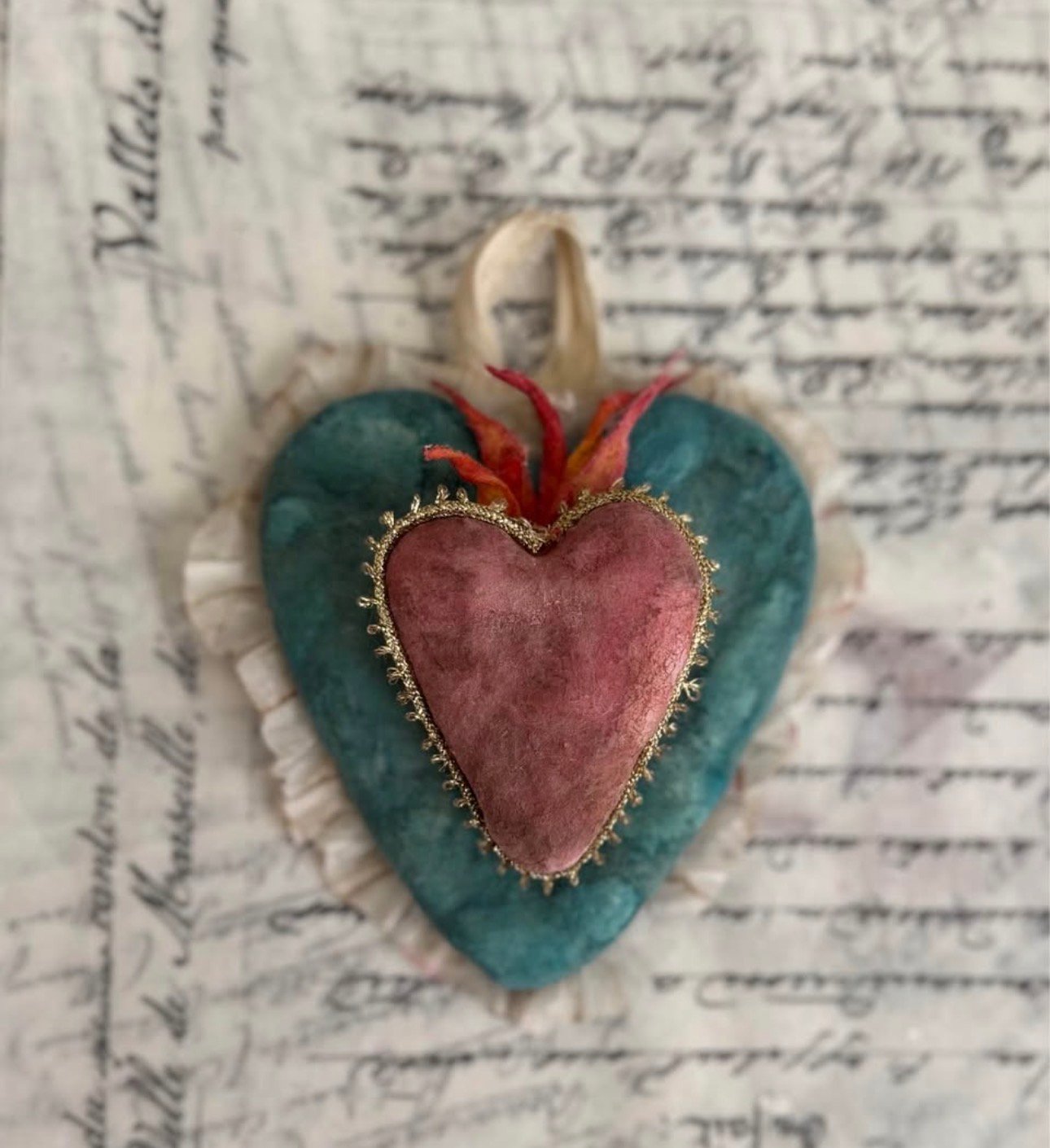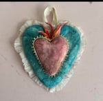 *Hand dyed crepe ruffle surrounds the larger aqua heart, the smaller heart is trimmed in vintage finds.