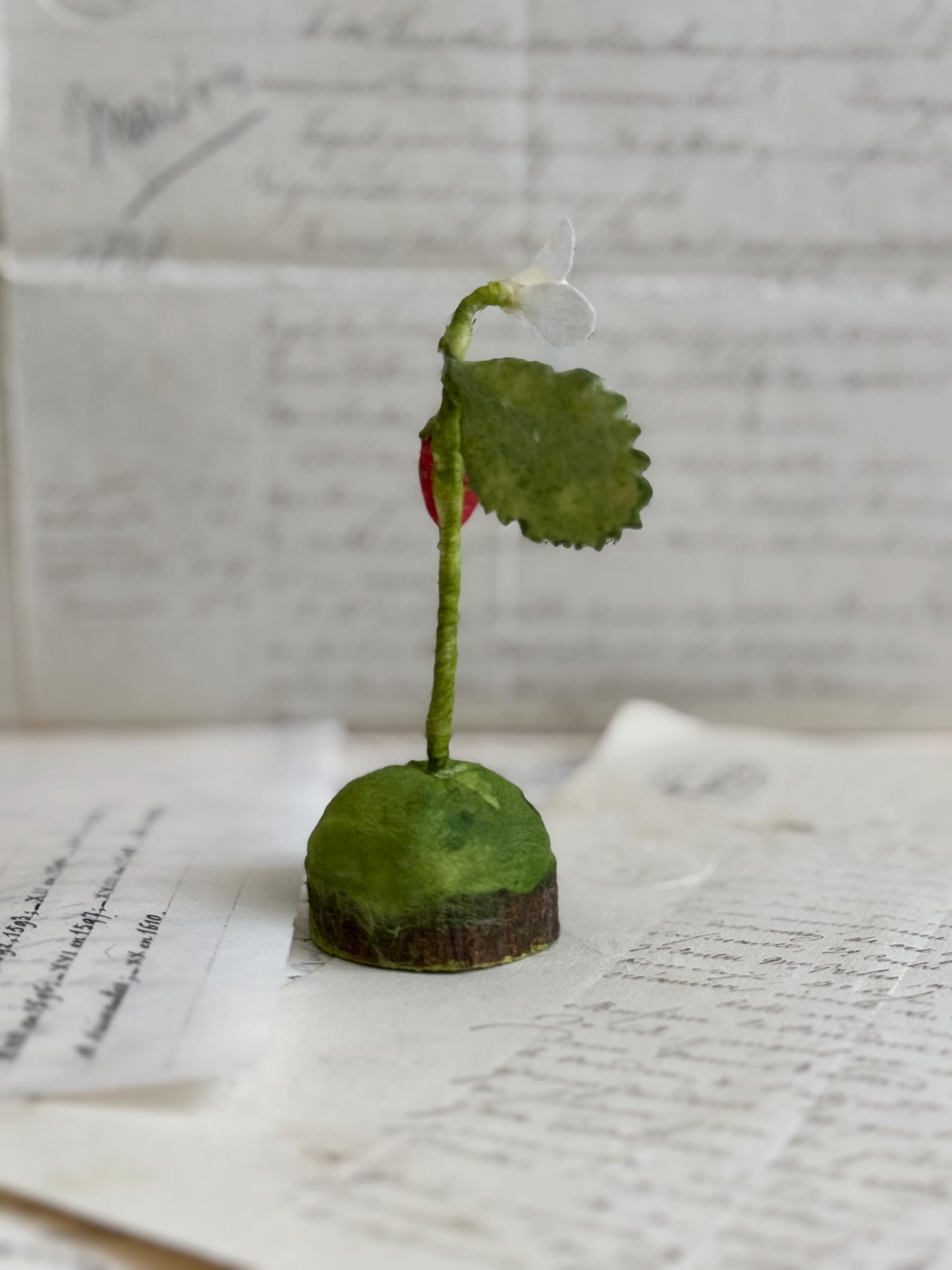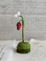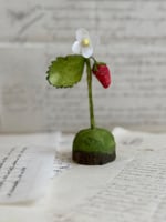 Self standing pink spun cotton strawberry and fabric flower on wood base with raw edge.