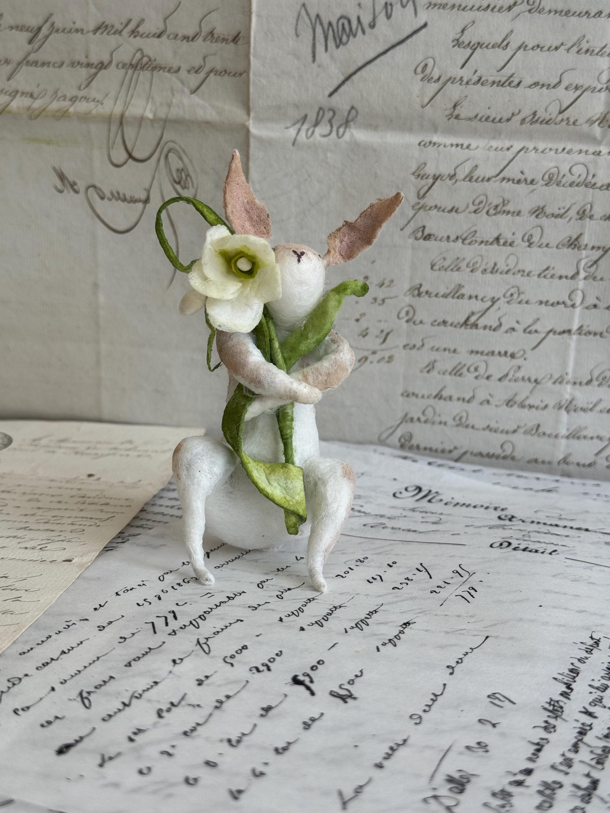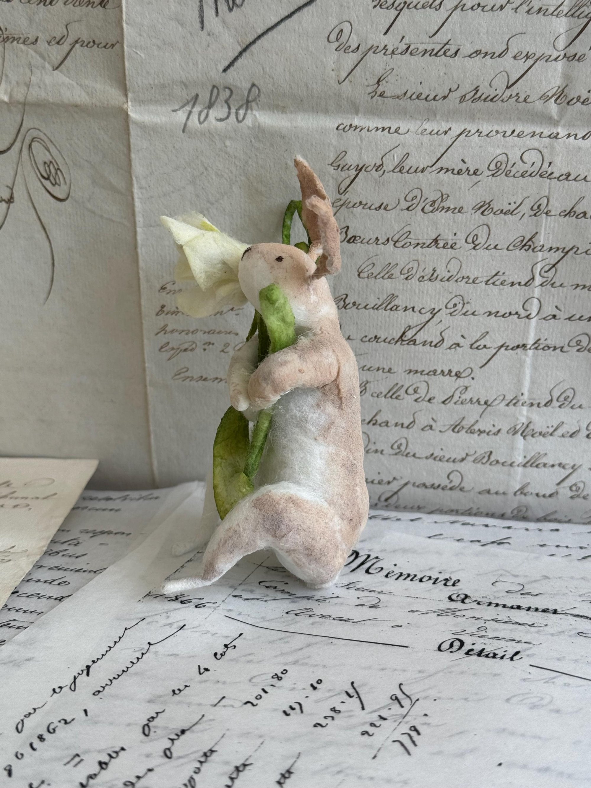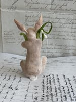 Spun cotton Easter bunny ornament carrying spring flowers on his back.